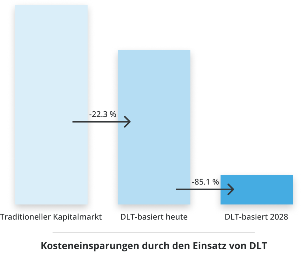 Finanzinstitute bauen auf DLT und Tokenisierungstechnologie da durch Prozesseffizienzen und den Wegfall von Intermediären über den Lifecycle von Finanzinstrumenten bis zu 85% Kosteneinsparungen realisiert werden. Erfahren Sie mehr über die Kosteneinsparungen durch den Einsatz von DLT im Kapitalmarkt in unserer Studie.